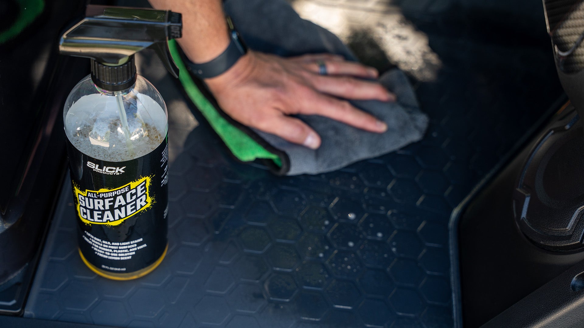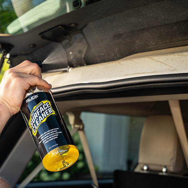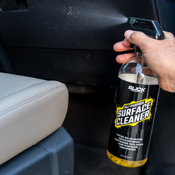 Keep your vehicle spotless inside and out with Slick Products All-Purpose Surface Cleaner. This ready-to-use spray quickly lifts dirt, oils, grease, and light stains from plastic, vinyl, rubber, carpet, and upholstery. Safe and effective on dashboards, seats, and door panels, it leaves a streak-free, low-sheen finish with a fresh lemon scent. Perfect for cars, trucks, ATVs, boats, and more—your go-to cleaner for every surface.