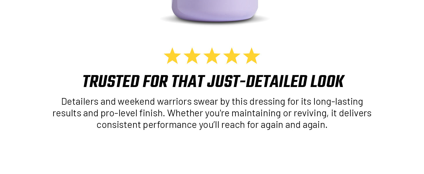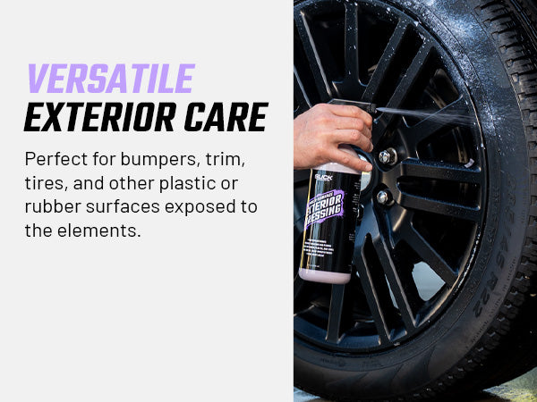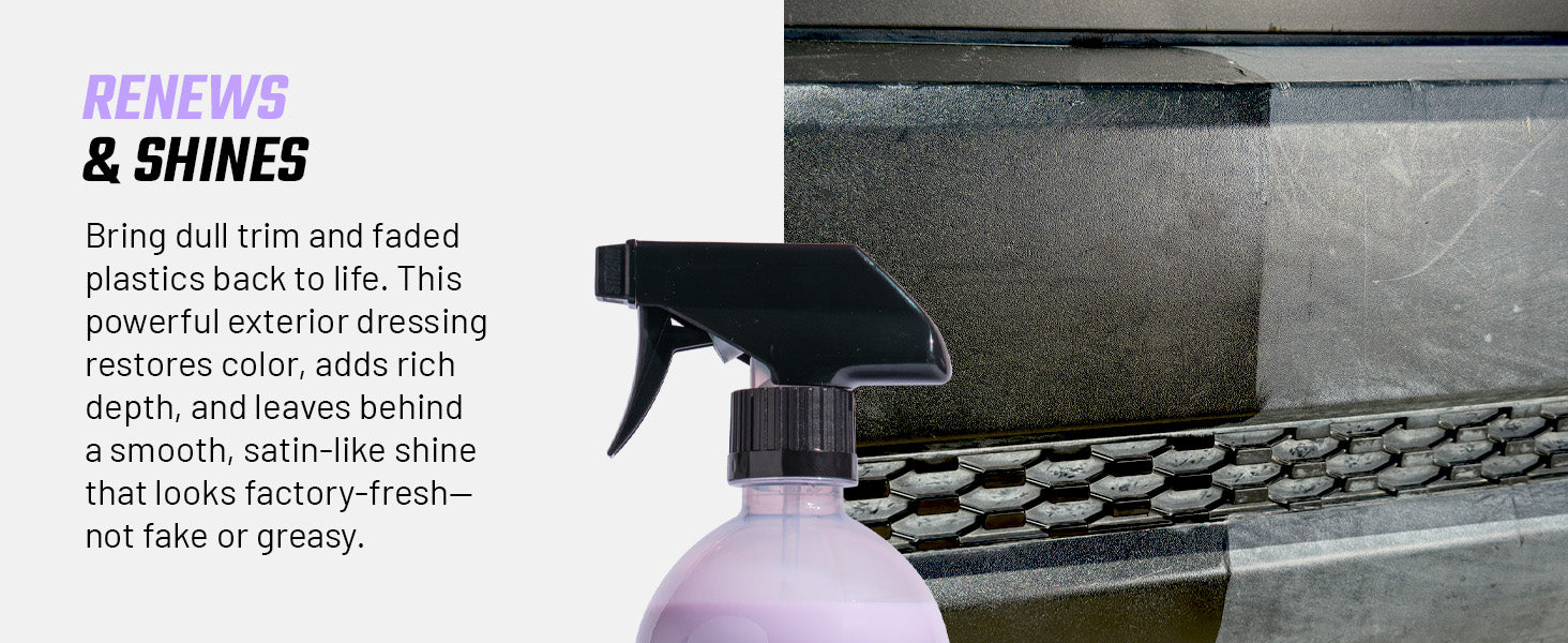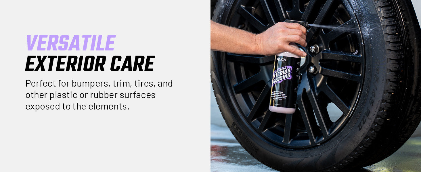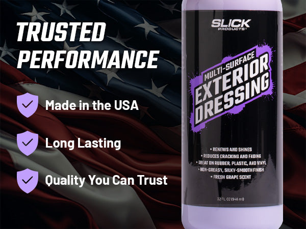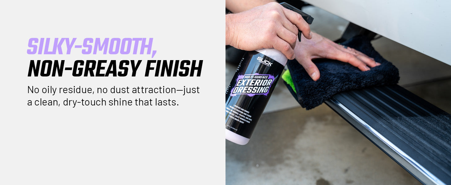 Slick Products Multi-Surface Exterior Dressing renews and shines surfaces while reducing discoloration, cracking, and fading. This non-greasy solution is best used on rubber, plastic, and vinyl, providing a silky-smooth finish. The ready-to-use cleaning solution should be applied directly to surfaces with a trigger sprayer or sprayed into a towel and then wiped on. Contains a fresh grape scent.