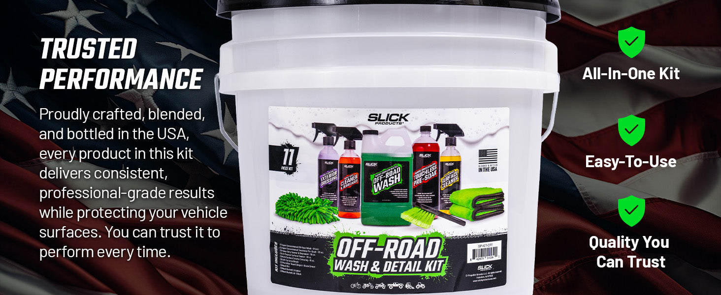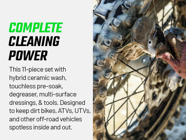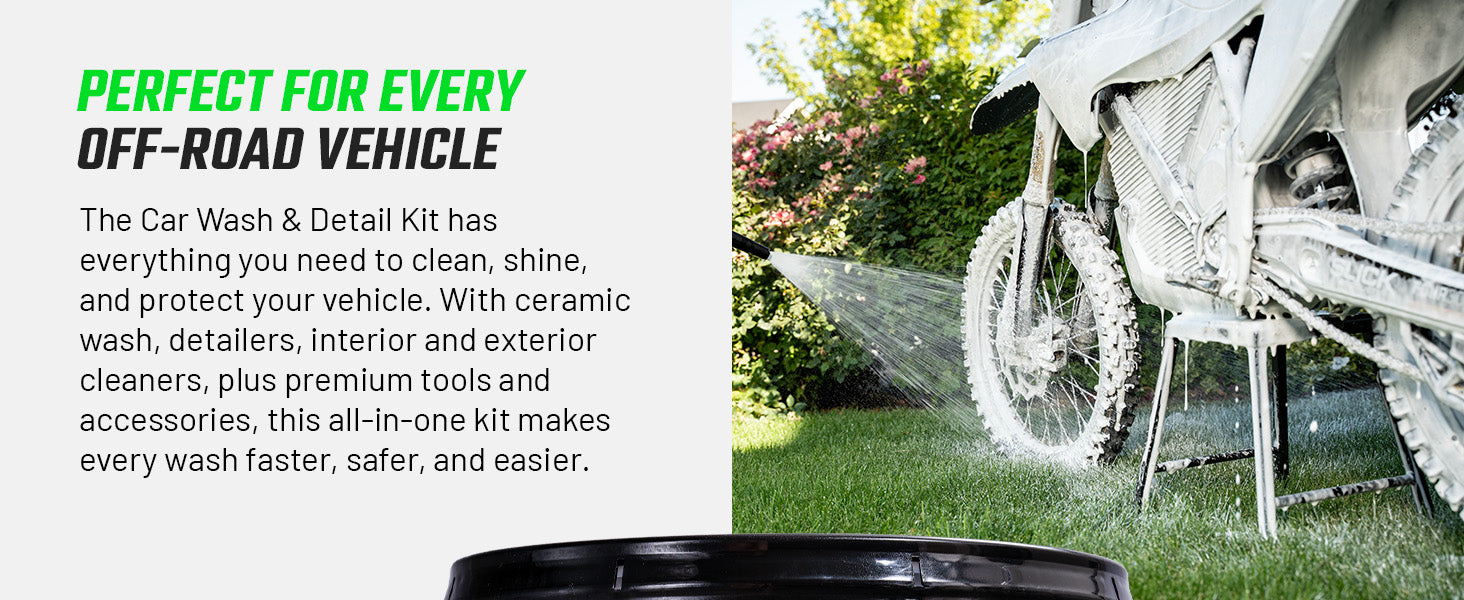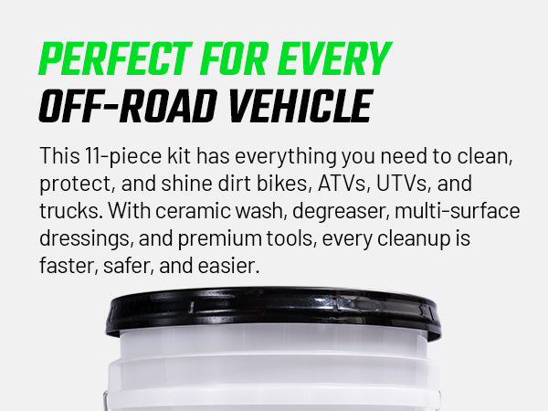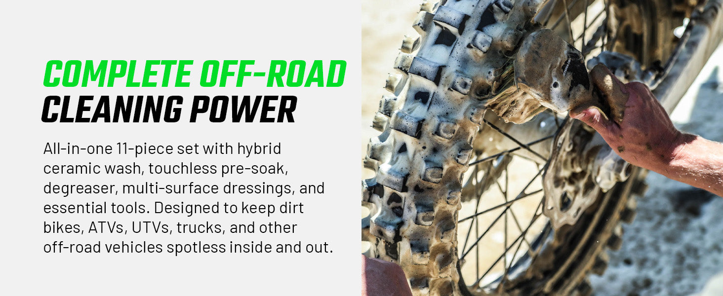 The Off-Road Wash & Detail Kit (11 Piece) is designed with everything you need to keep your dirt bikes, ATVs, UTVs, bikes, trucks, and other off-road vehicles looking their best. These high-quality detailing products are guaranteed to make your next cleanup faster, safer, and easier.
