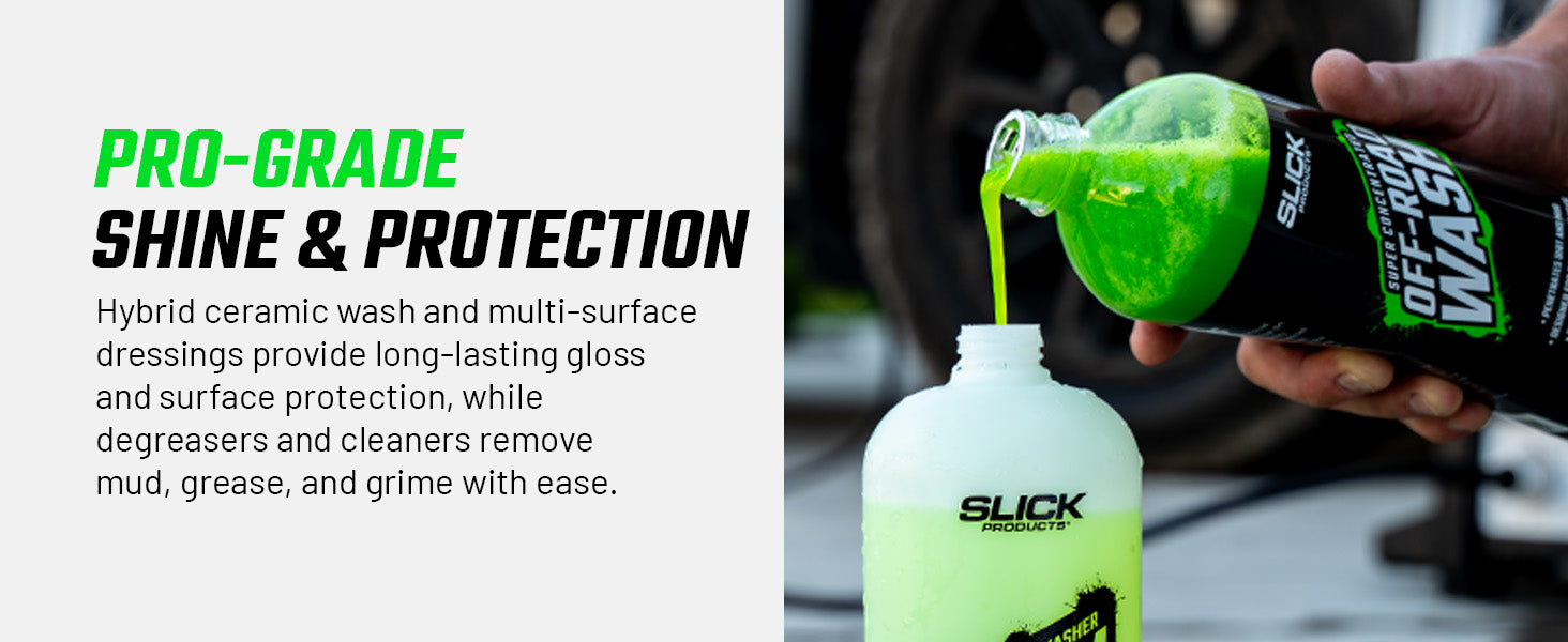 Slick products are easy to use and leave the equipment virtually new. Slick easily takes off dirt, grime, dust, dried-on old mud, salt, smudges, and gook of all sorts.