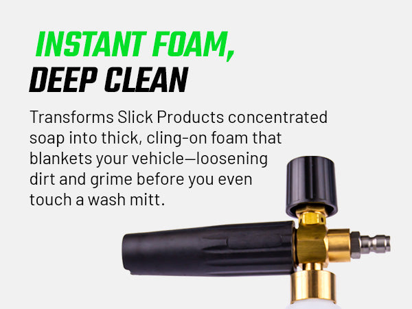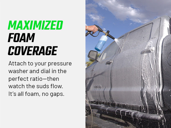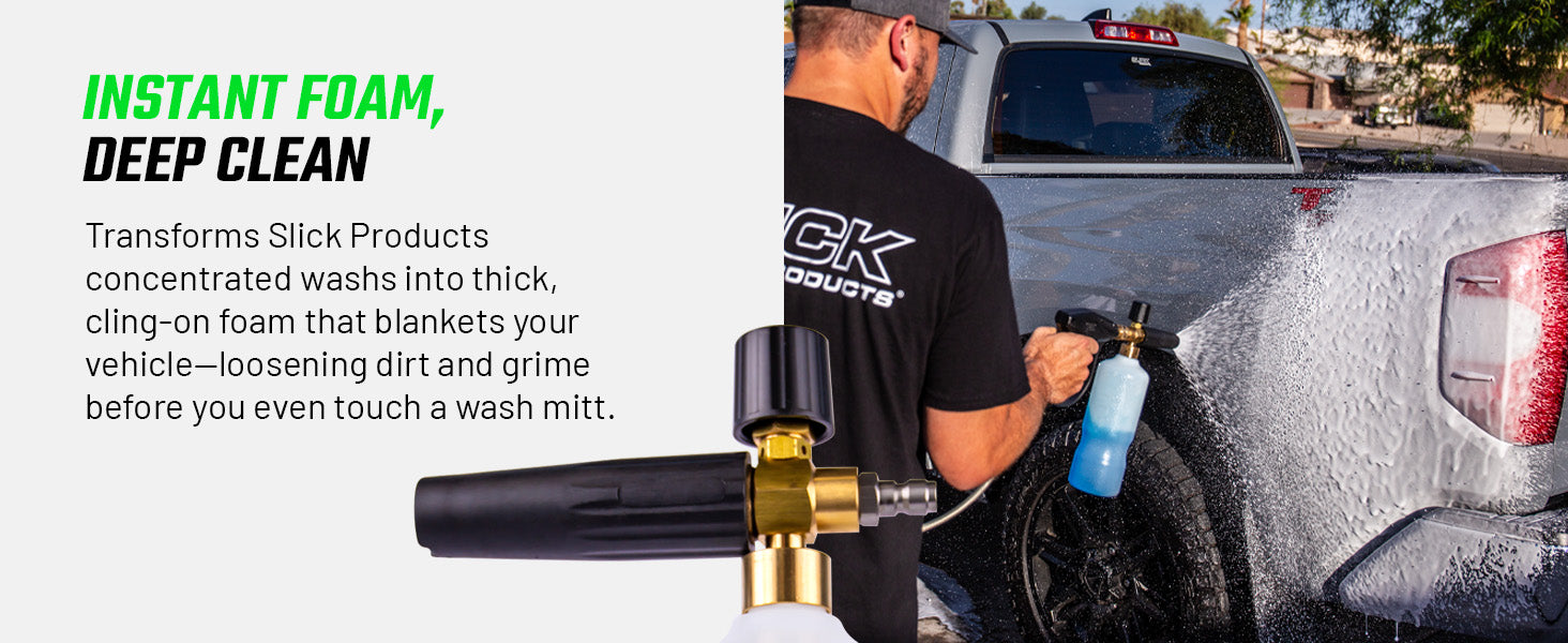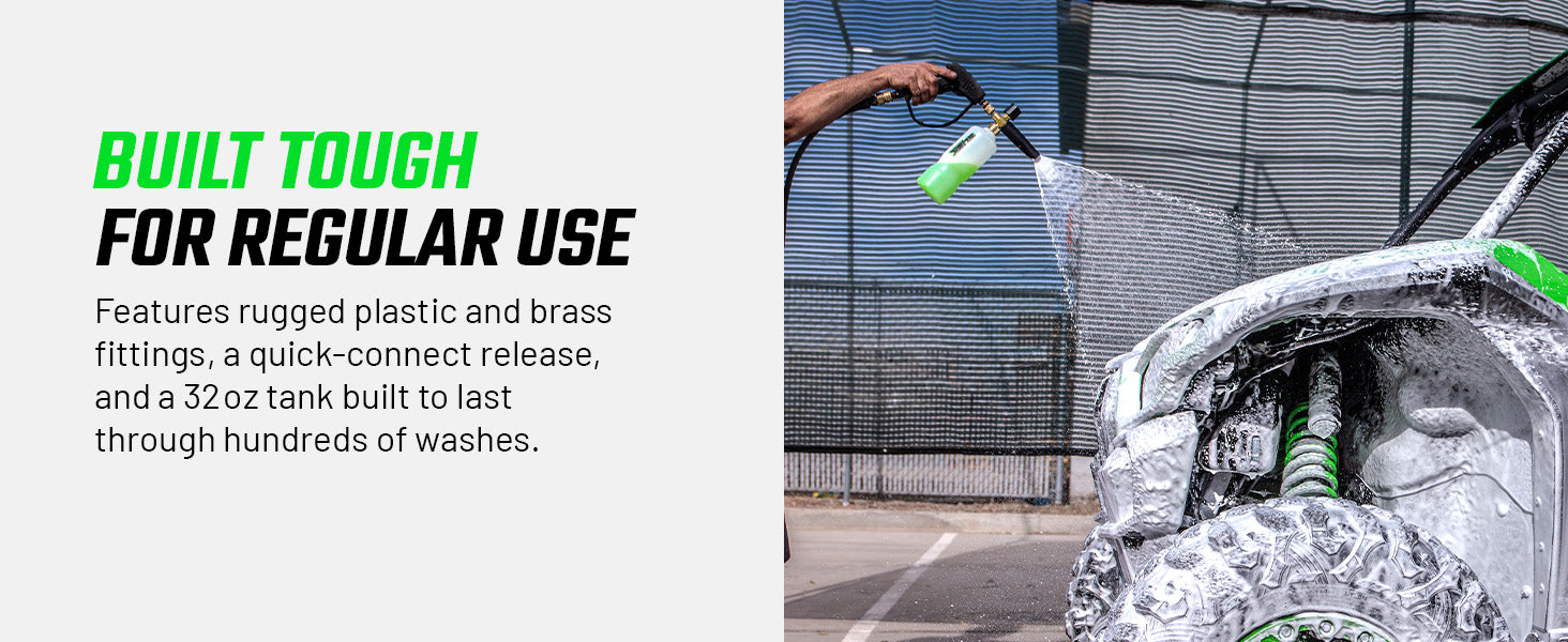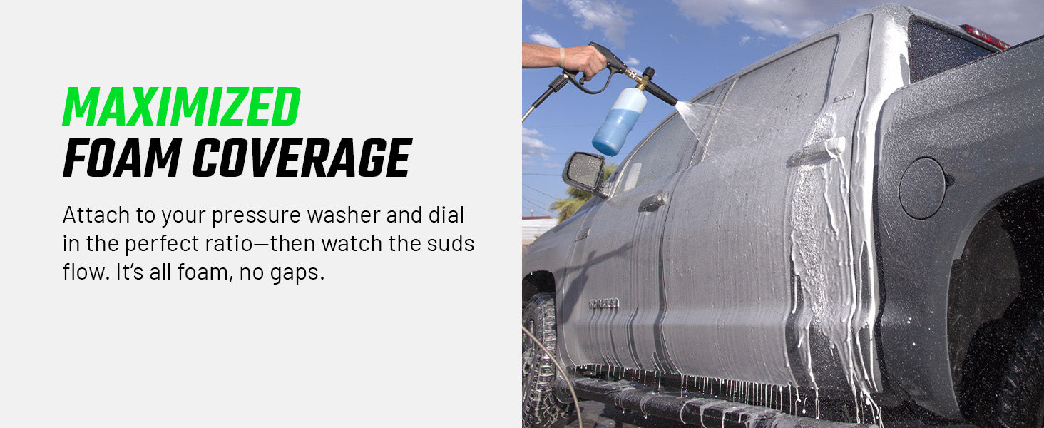 Durable Foam Cannon attaches to pressure washer wand with the 1/4" quick connect inlet and designed to quickly mix our concentrated soap into a foamy wash.
