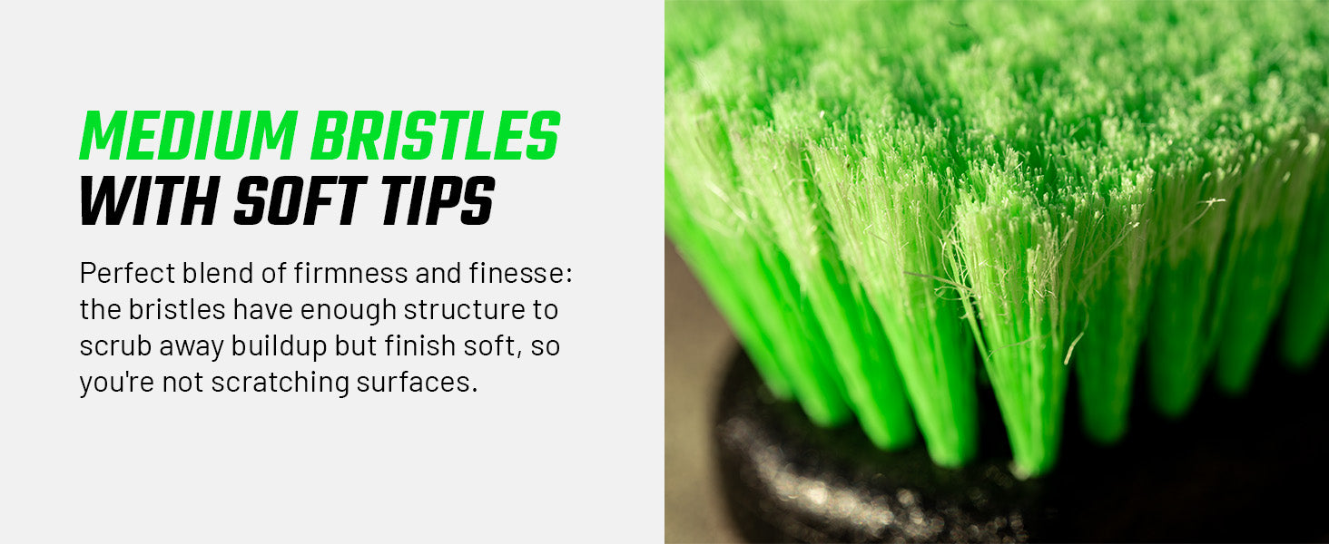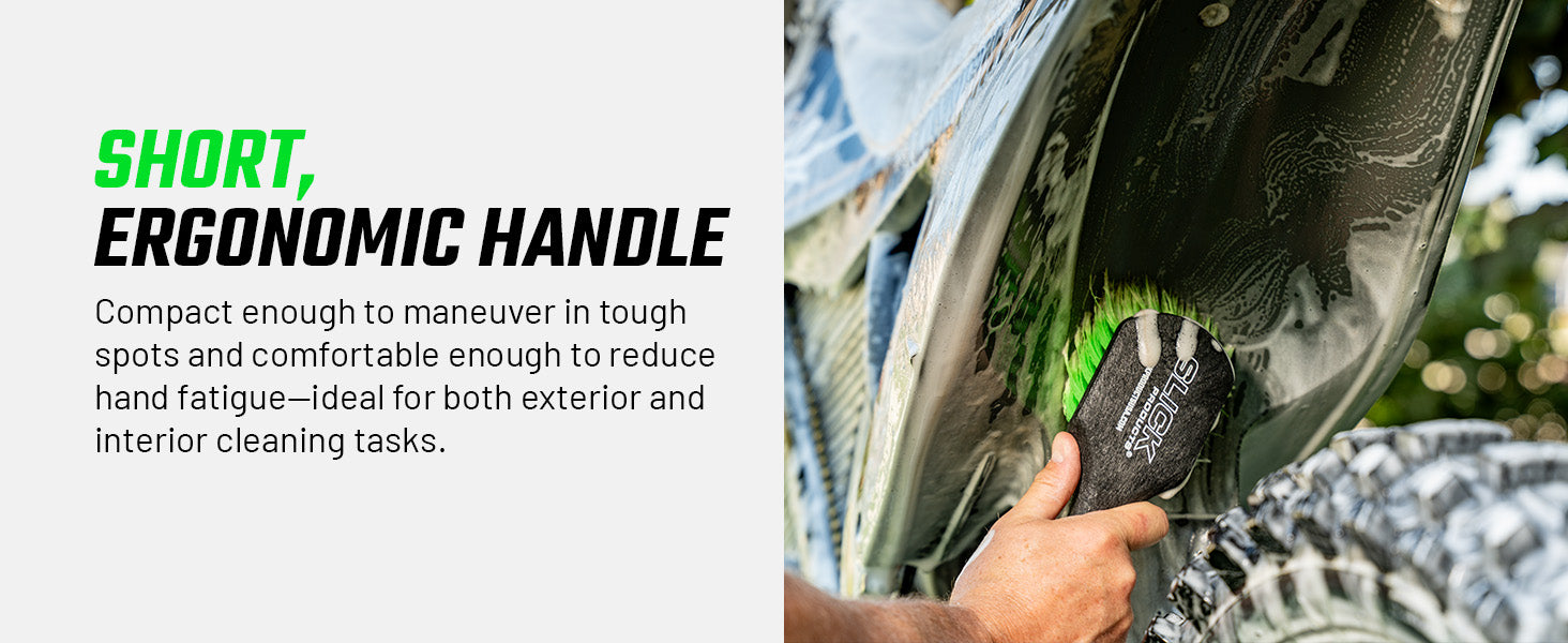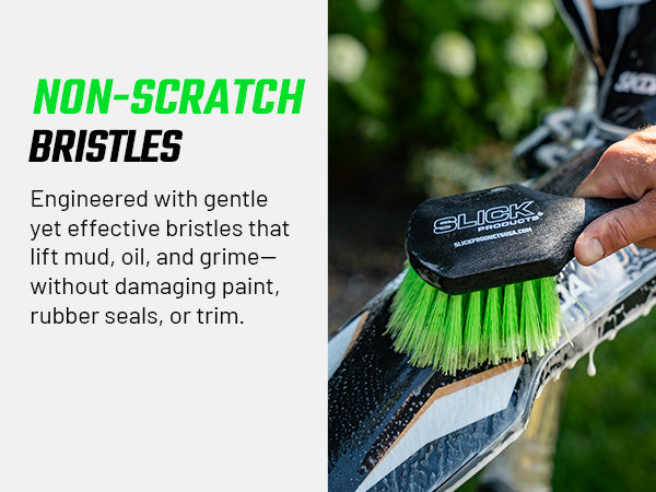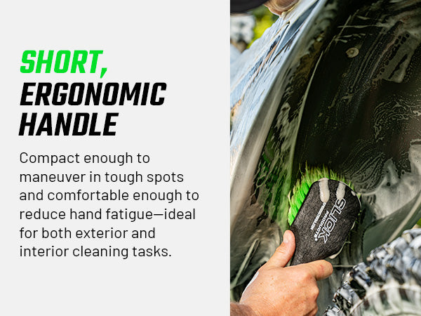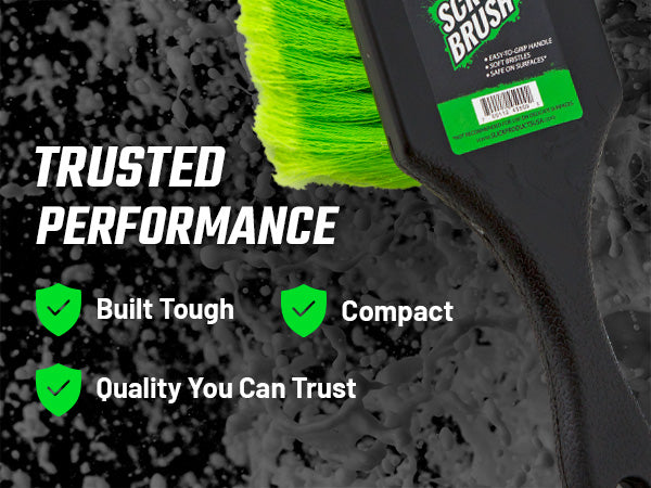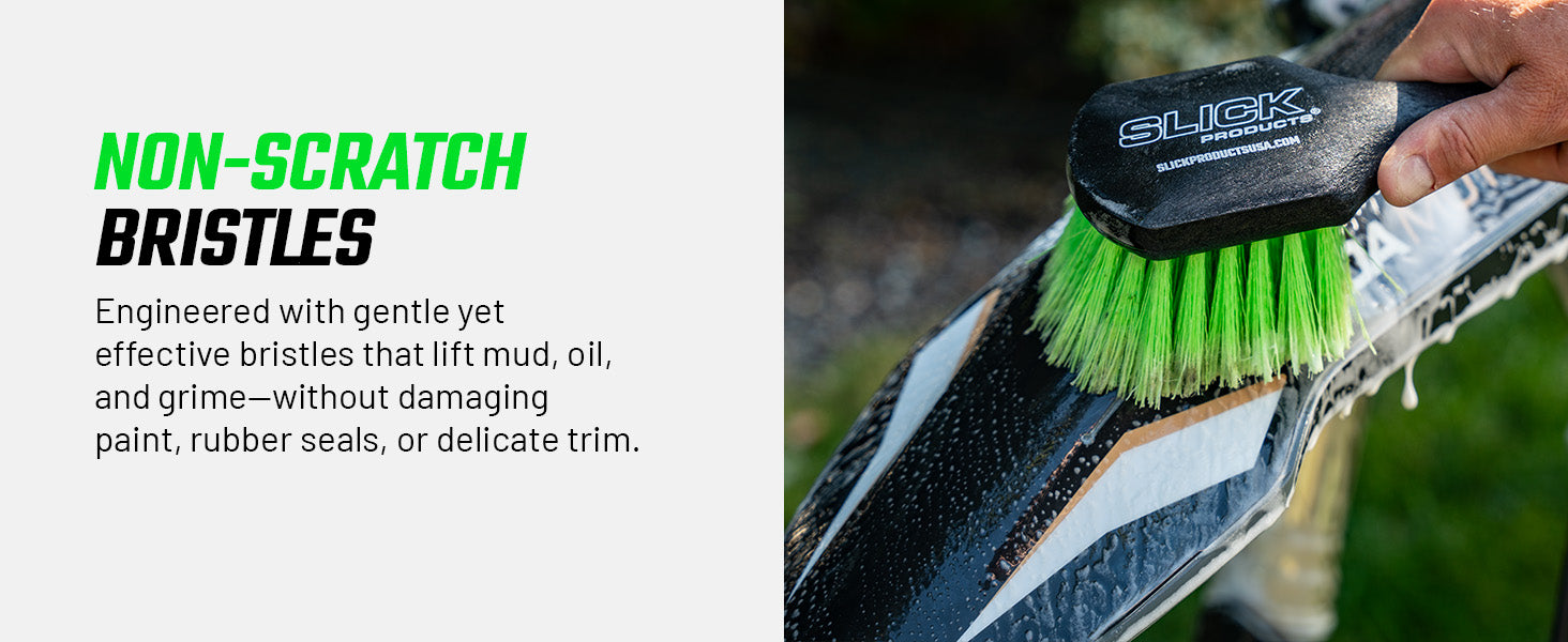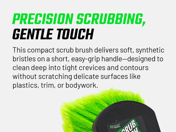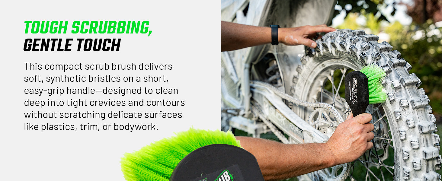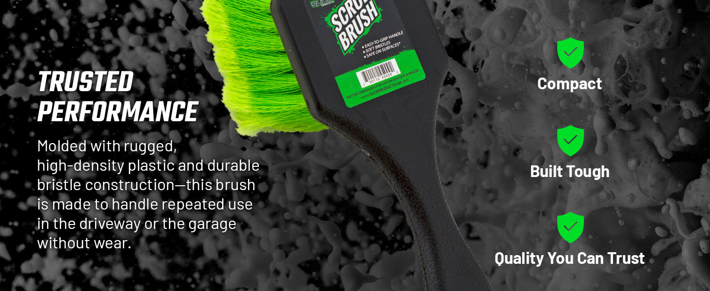 Slick Products Scrub Brush is a durable plastic short-handled brush with soft synthetic bristles designed to maneuvering in hard-to-reach areas and safely clean without scratching surfaces. Quickly and easily clean away dirt, oils, and grime.