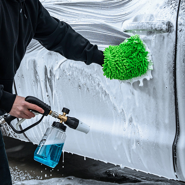 Dilute the concentrated soap solution in a bucket, foam gun, or foam cannon. Pre-rinse heavy or thick mud from the surface. Apply the soap solution and allow it to soak for 1-2 minutes without drying. Agitate with a non-scratch brush or wash mitt, then rinse thoroughly.