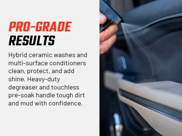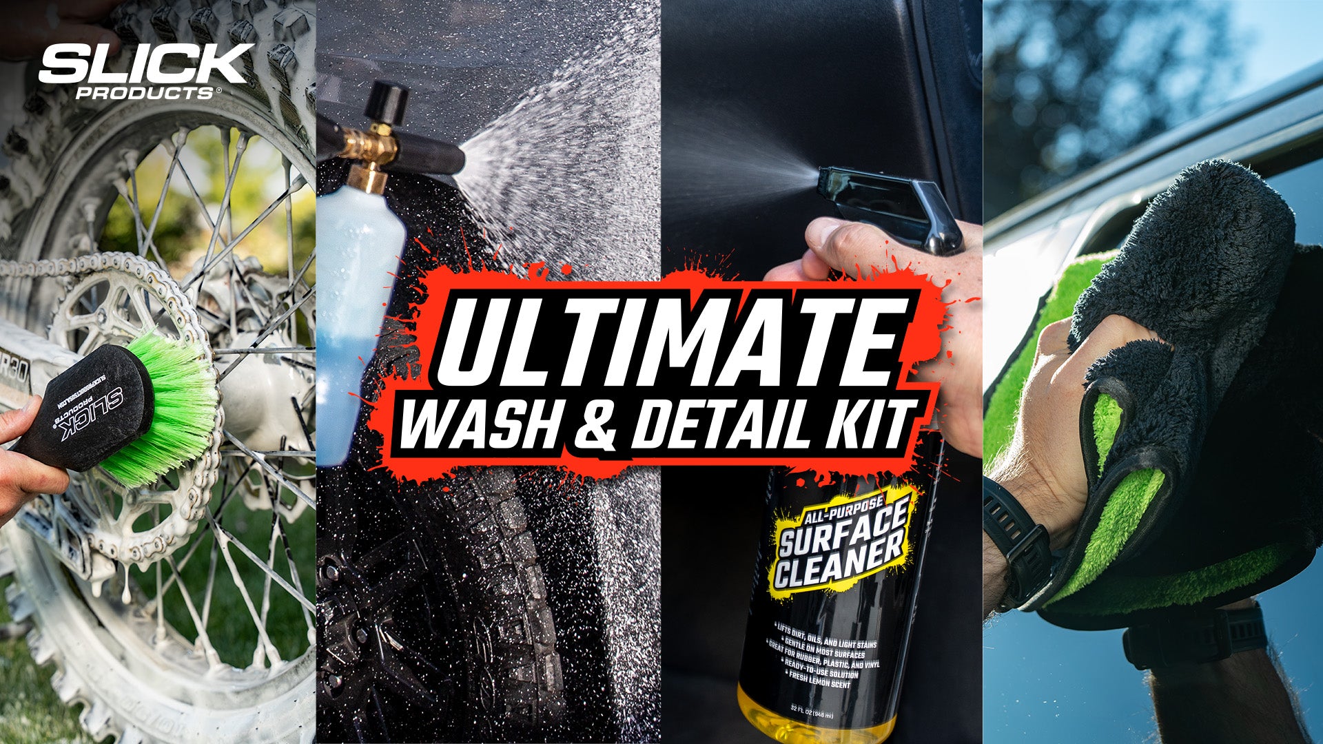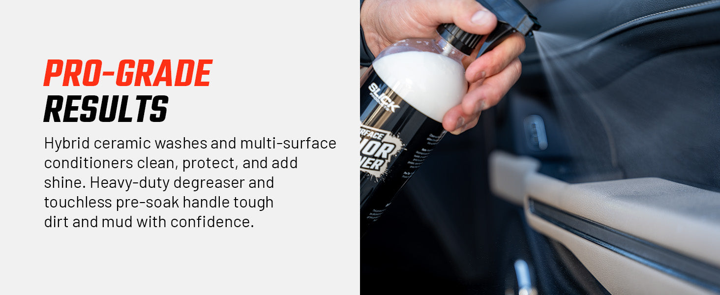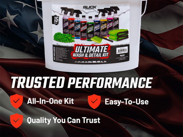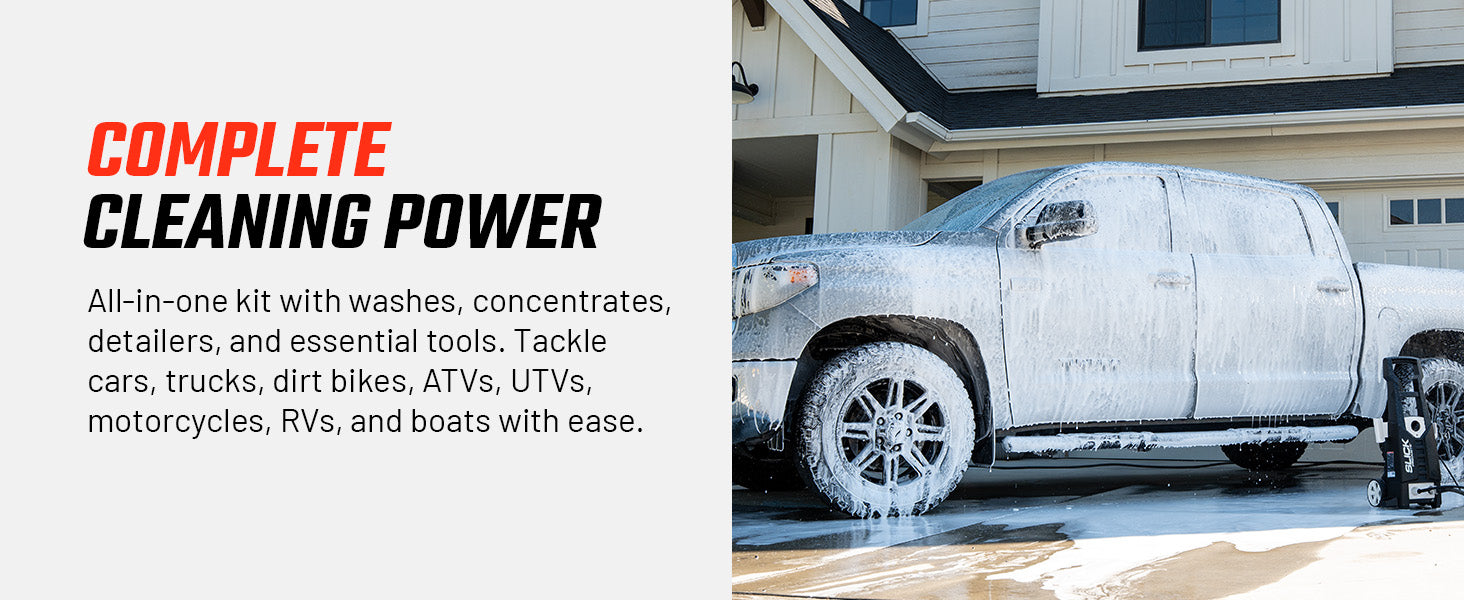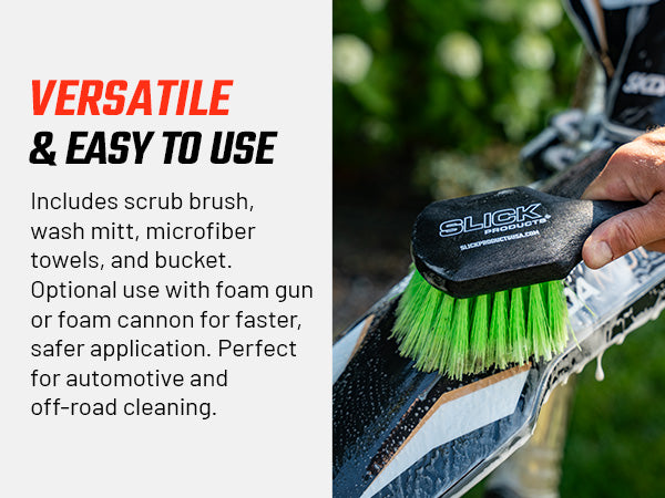 Keep every vehicle spotless with the Slick Products Ultimate Wash & Detail Kit (15-Piece). This complete set is perfect for cars, trucks, dirt bikes, ATVs, UTVs, motorcycles, and RVs, offering everything you need to wash, clean, and detail like a pro. Featuring hybrid ceramic washes, touchless pre-soak, heavy-duty degreaser, streak-free glass cleaner, and multi-surface interior and exterior conditioners, this kit delivers a professional-grade clean while protecting surfaces with advanced wax and ceramic technology. The included scrub brush, microfiber towels, wash mitt, and 3.5-gallon wash bucket with lid make washing faster, safer, and easier. From tough mud and grime to everyday dust and dirt, this kit ensures your vehicles look their absolute best every time.